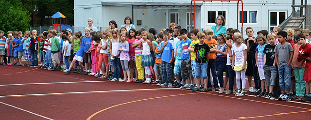 Die Schüler, Geschwisterkinder und auch ehemalige Michael-Ende-Grundschüler vergnügten sich an zahlreichen Spielstationen, die das Lehrerkollegium vorbereitet hatte. Hier konnten die Kinder ihre Treffsicherheit beim Dosen- oder Zielwerfen unter Beweis stellen, ihre Kraft beim Tauziehen messen, ihre Geschicklichkeit, Schnelligkeit, sowie ihre Sinne beim Eierlauf, bei Tastspielen oder beim Wasserlauf erproben. Auch der Kreativität wurde beim Kinderschminken oder beim Bemalen von Steinkäfern Rechnung getragen.