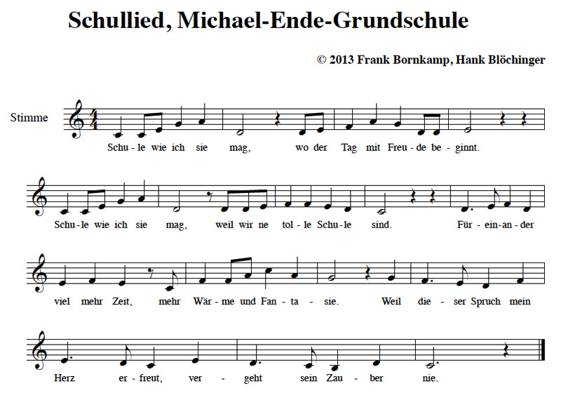 Im Juni 2012 befragte Herr Bornkamp zunächst die Lehrerinnen, was die Michael-Ende-Schule ausmache und baute diese Inhalte dann in die Strophen ein, so dass sich alle gut mit dem Text identifizieren konnten.