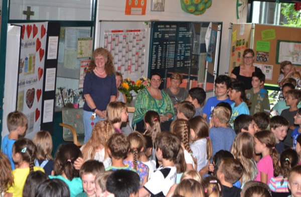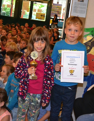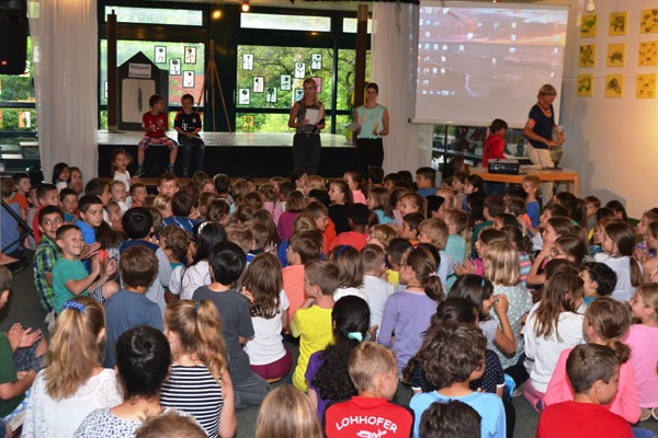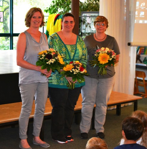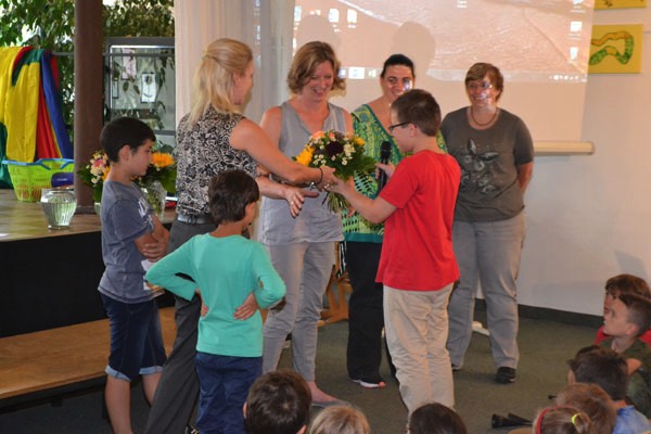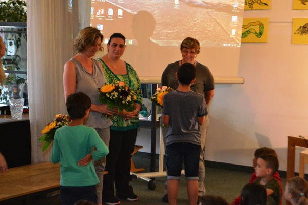 Nach der Ehrung der Wettbewerbssieger galt es, ein herzliches Dankeschön an unsere drei Schwimmhelferinnen auszusprechen, die das ganze Schuljahr über die Kinder liebevoll und aufmerksam beim Schwimmen unterstützt haben. In der Schulversammlung übernahmen dies drei Schüler, doch gilt das Dankeschön natürlich im Namen aller Schüler und Schülerinnen sowie aller Lehrer.