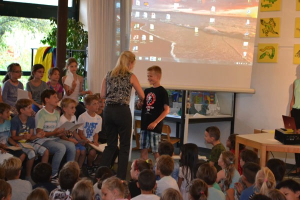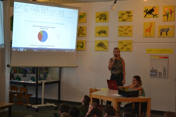 Ein weiterer Programmpunkt war die Rückschau auf die Projekttage, die vergangenen Monat stattfanden. Alle Schülerinnen und Schüler hatten im Anschluss daran einen Bogen ausgefüllt, auf dem sie bewerteten, was ihnen an den drei Tagen besonders gut und was ihnen weniger gefallen hatte. Die Auswertung dieser Bögen konnten wir uns in der Schulversammlung auf der Leinwand in Form von Kreisdiagrammen ansehen. Dabei wurde deutlich, dass die Kinder große Freude an den Projekten hatten, die sie selbst auswählen konnten. Es war spannend für sie, einmal mit anderen Lehrkräften und anderen Schülern zusammenzuarbeiten.