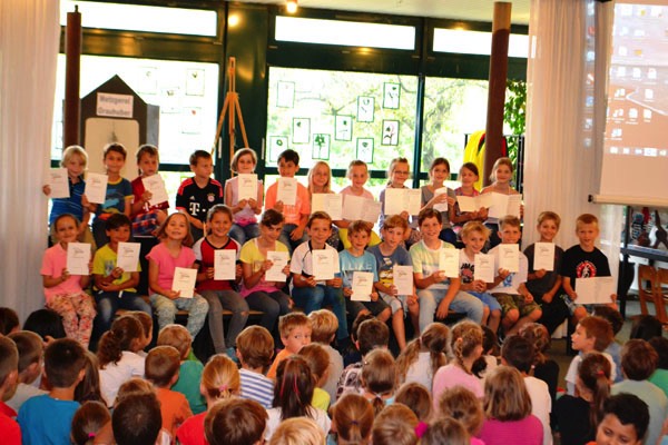 Weiter ging es mit einem anderen sportlichen Thema: Für besonders gute Leistungen am Sportfest wurden nun die Ehrenurkunden verliehen. Je Jahrgangsstufe wurden die besten Kinder nach vorn gerufen, um ihre wohl verdiente Urkunde in Empfang zu nehmen.