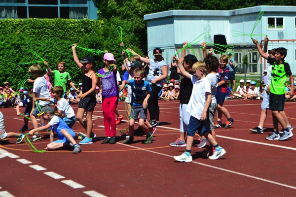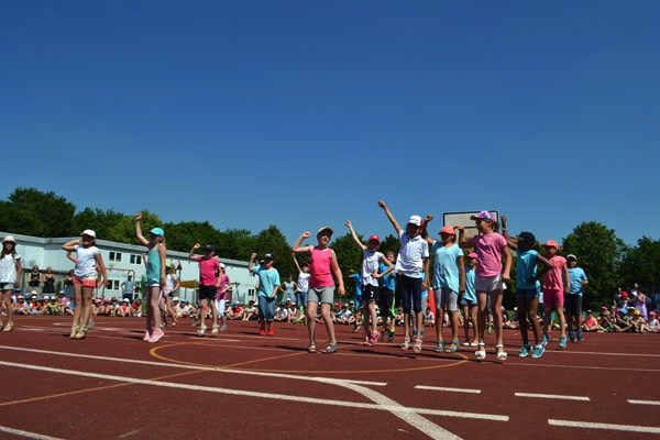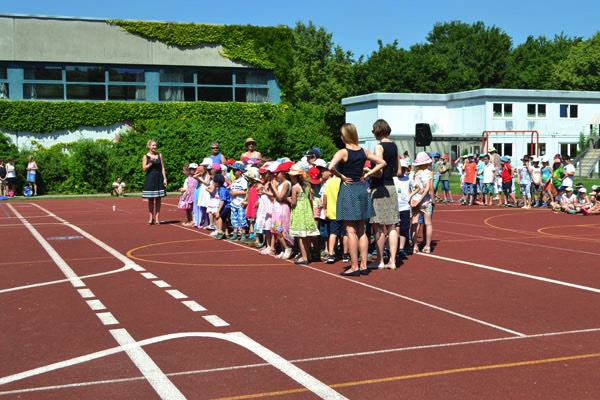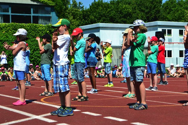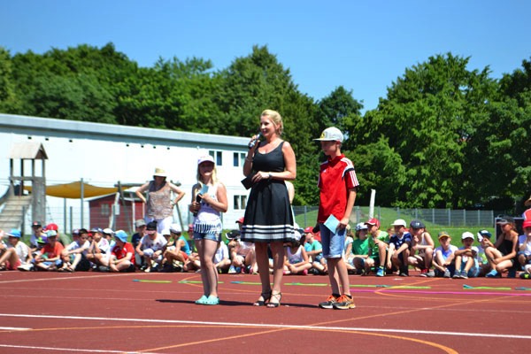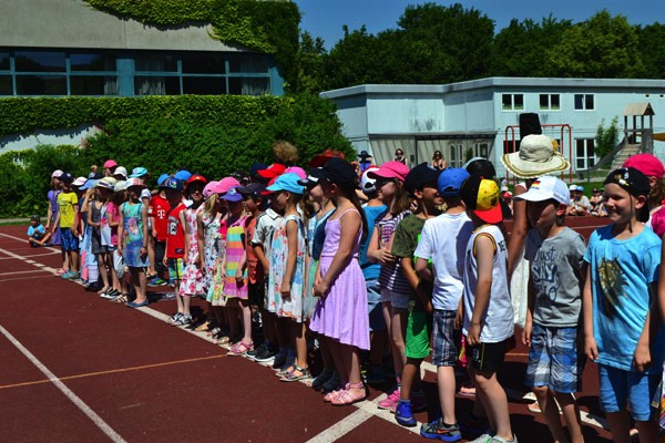 Zum diesjährigen Schulfest marschierten am frühen und schon sehr heißen Nachmittag alle 13 Klassen mit ihren Lehrerinnen auf dem Sportplatz ein, wo die Eltern, Großeltern und Freunde unserer Schule bereits freudig warteten. Nach einer kurzen Begrüßung durch unsere Schulleiterin Frau Ehrichs führten eine Schülerin und ein Schüler aus der vierten Klasse durch das Programm. Diese bedankten sich zu Beginn bei all den Menschen, die durch ihre tatkräftige Unterstützung unsere Schulfamilie zu dem machen, was sie heute ist.