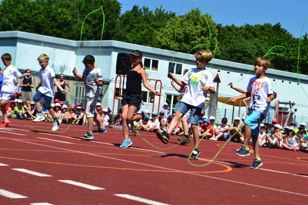 Besonders lang und eifrig für ihre Aufführung geübt hat die Klasse 4c mit ihrer Klassenlehrerin Frau Pfleger. Sie führten ein abwechslungsreiches und akrobatisches Programm im Seilspringen auf, das uns alle begeisterte.