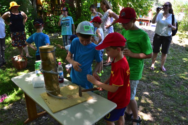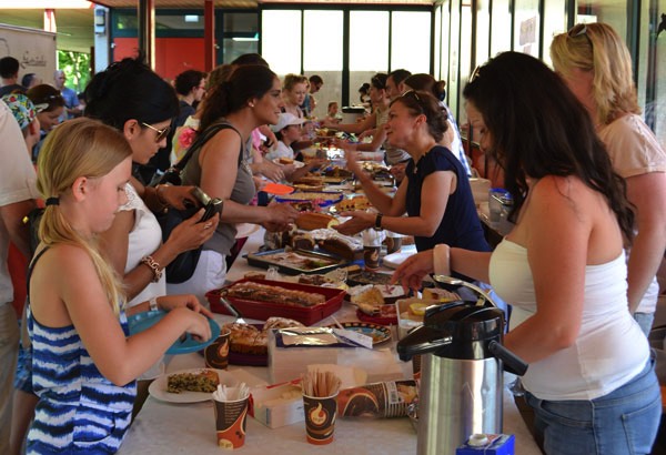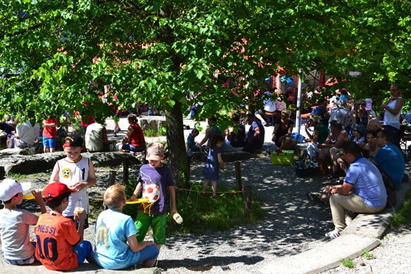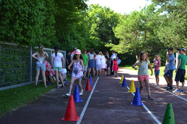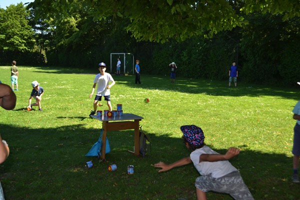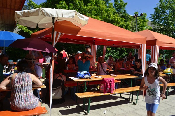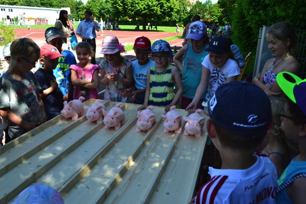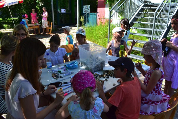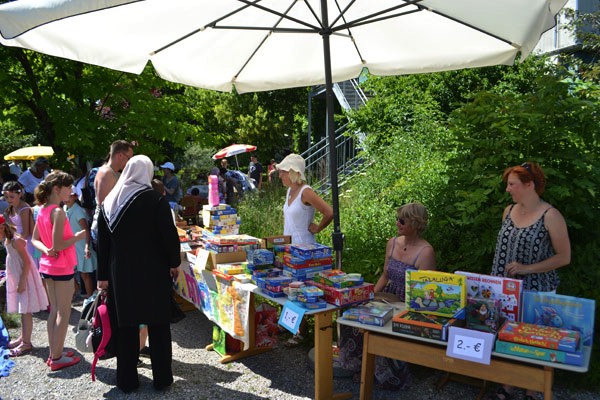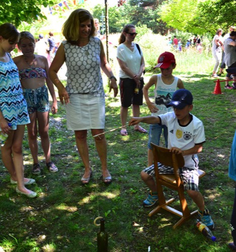 Nach diesem sehr abwechslungsreichen Programm verteilten sich die Schüler und die Gäste auf dem schönen Pausenhof, um sich entweder am Buffet zu stärken, das liebenswerterweise wieder vom Elternbeirat organisiert wurde, oder sich an den vielen verschiedenen Spielstationen der einzelnen Klassen zu versuchen.