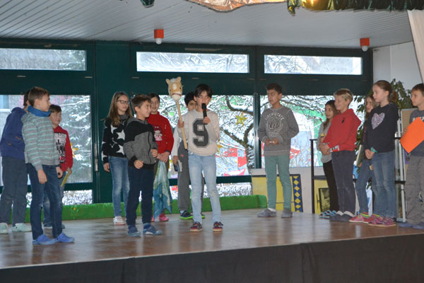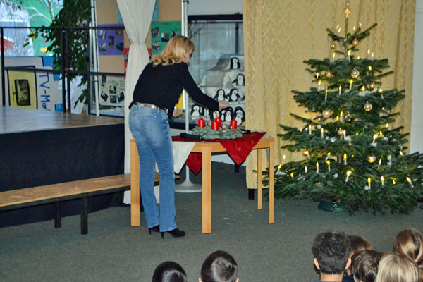 Wie auch an den kommenden Montagen bis zu den Weihnachtsferien treffen sich hierzu alle Klassen am Morgen in der Aula, wo jede Woche eine weitere Kerze am Adventskranz angezündet wird. Dazu singen alle Schülerinnen und Schüler „Wir sagen euch an den lieben Advent“.