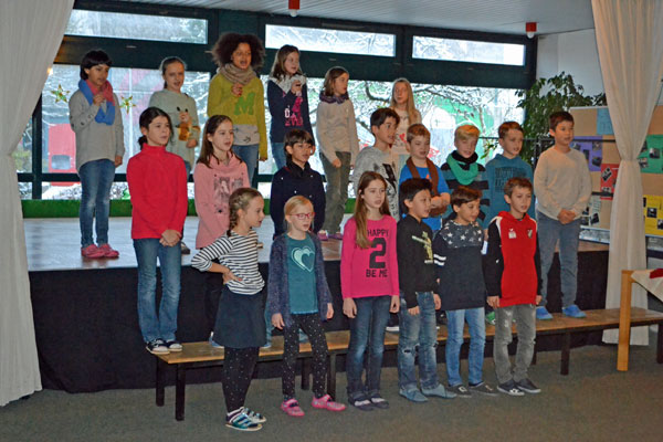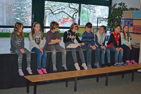 Die heutige Feier wurde von den vierten Klassen gestaltet. Einige Kinder der Klasse 4b lasen uns „Das Weihnachtsmärchen“ nach Helmut Wöllenstein vor, welches zum Nachdenken anregte. Anschließend sang die Klasse 4a das Lied „Feliz Navidad“ von José Feliciano, das der ein oder andere bestimmt aus dem Radio kennt. Ein paar Schülerinnen begleiteten das englisch-spanische Lied rhythmisch mit kleinen Rasseln.