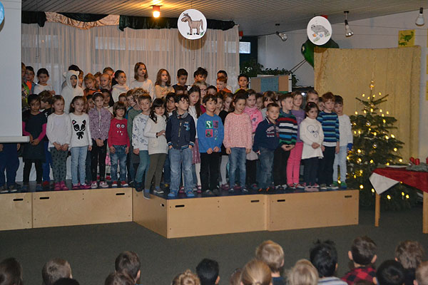 Den Anfang machten die ersten Klassen. Die Kinder warteten bereits auf der Bühne auf die anderen Schülerinnen und Schüler, um ihnen das Lied „Schneeflöckchen Weißröckchen“ von Hedwig Haberkern vorzusingen. Nach dieser musikalischen Einlage sagten uns die Kinder der zweiten Klasse das Gedicht „Schneemanslos“ von James Krüss auf. Passend zu den Strophen, wurden dazu selbst gemalte Bilder gezeigt.
