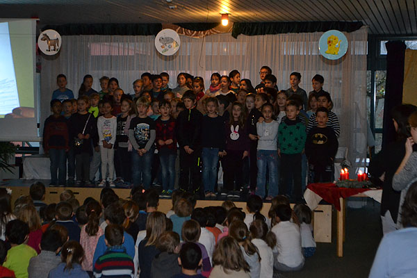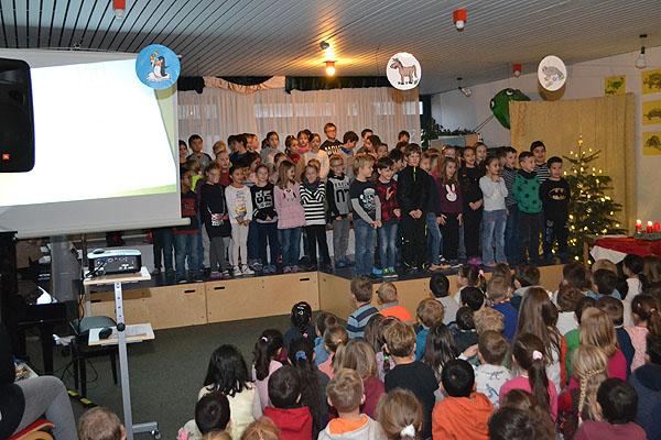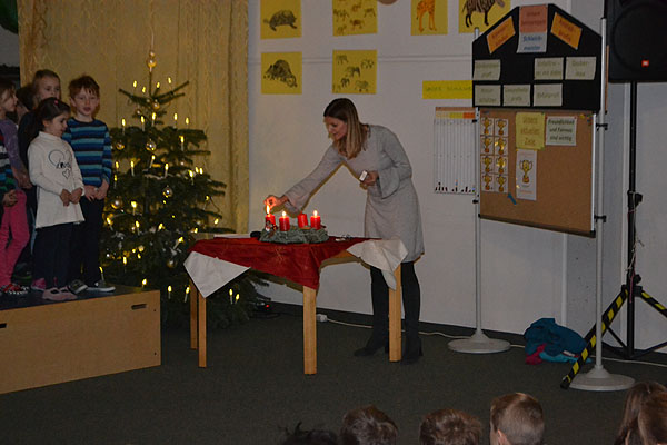 Nur noch sechs Türchen bleiben am Adventskalender übrig. Weihnachten rückt immer näher und deshalb hatten wir auch diesen Montag wieder allen Grund dazu uns bei unserer dritten Adventsfeier gemeinsam auf Heiligabend zu freuen. Nachdem Frau Martin die dritte Kerze am Adventskranz angezündet hatte, konnten uns die vier ersten und die drei zweiten Klassen zeigen, wie viel sie für diese Zusammenkunft geübt hatten, um sie ganz besonders zu gestalten