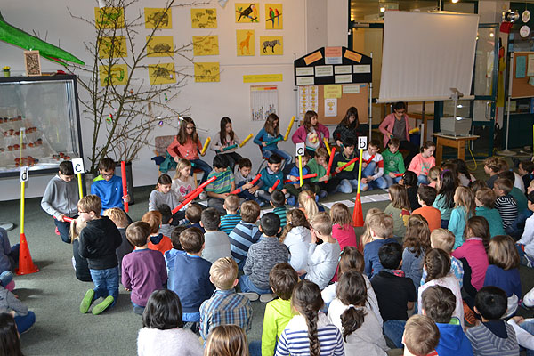 Im Anschluss an die Siegerehrung stellte die Klasse 4b das neue Ziel „Tier- und Pflanzenfreund“ vor. Gemeinsam mit Frau Christoph hatte die Klasse Szenen einstudiert, die den Kindern zeigten, wie wir alle mithelfen können, dass unser toller Pausenhof so schön bleibt, wie er ist: