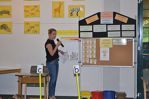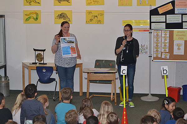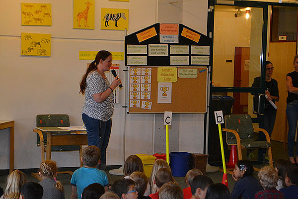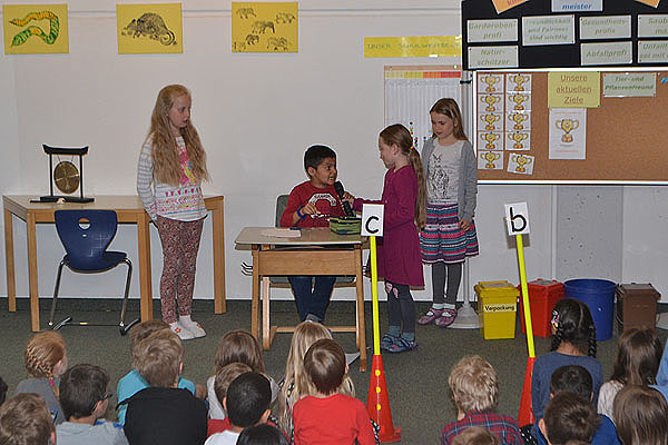 Im Rückblick auf das aktuelle Schulziel „Tier- und Pflanzenfreund“ kann man unsere Schüler ganz besonders loben, denn alle haben am Frühjahrspflegetag dazu beigetragen, dass die Pflanzen und kleinen Tierchen auf unserem Pausenhof gut wachsen und leben können. Auch das Weidentipi und der Teich erstrahlen sozusagen „in neuem Glanz“, nachdem sie von vielen Schülern, Eltern und Lehrern am letzten Freitag repariert und gereinigt wurden. Diese Woche haben allerdings die Kinder aus der Klasse 3c besonders Rücksicht auf die Tier- und Pflanzenwelt genommen und so durften sie den Pokal für diese Woche verdient entgegennehmen.