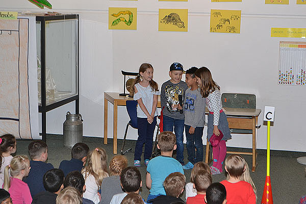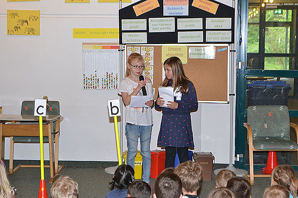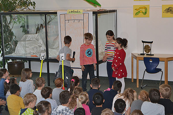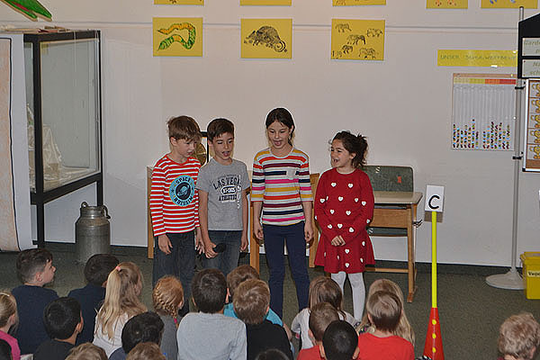 Das Schulziel für die kommenden Wochen stellten uns die Klassen 2b und 2c vor. Wie wir nach jeder Szene hören konnten, heißt es „Sauberkeit - das ist fein – das hält unsere Schule rein!“. Die Kinder zeigten uns mehrere Beispiele, wie das geht. Ordnung auf den Schulgängen ist genau so wichtig wie im Klassenzimmer oder unter der Schulbank.