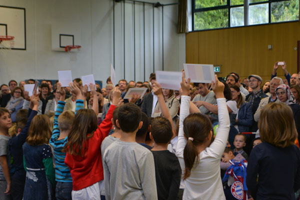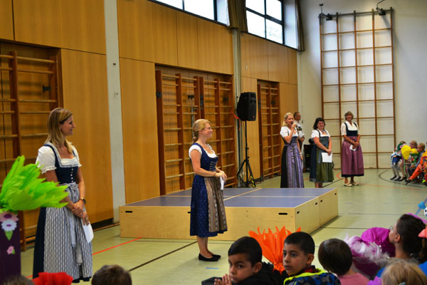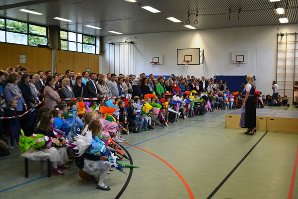 Um sie in der Michael-Ende-Schule willkommen zu heißen, wurden sie mit dem Begrüßungslied „Unsre Schule feiert heut“ von den 2. Klassen in Empfang genommen. Nun begrüßte auch Frau Ehrichs alle Eltern, Großeltern und natürlich die Hauptpersonen des Tages, die Erstklasskinder. In ihrer Begrüßungsrede ging sie auf die Situation der neuen Schulkinder ein, stellte die weiteren Mitarbeiter an der Schule vor und versicherte den Eltern, dass die Schule alles tun wird, um den Kindern die Eingewöhnung möglichst leicht zu machen. Sie bat die Eltern um ihre Unterstützung und Mithilfe in allen Schulangelegenheiten und darum die Kinder nach der ersten Eingewöhnungsphase vor der Schultüre zu verabschieden und nicht mehr mit ins Schulhaus zu kommen.