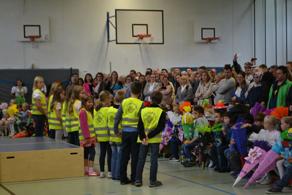 Um 9.00 Uhr war es dann auch für die neuen Erstklasskinder soweit! Sie erschienen nun zu ihrem ersten Tag an der Schule und machten somit die Schulfamilie wieder komplett. Wie üblich fand die Begrüßung in der großen Turnhalle statt. Helferkinder aus der 4. Klasse zeigten den Kleinen den richtigen Weg zu ihren Plätzen. Frau Ehrichs und die vier Erstklasslehrerinnen Frau Jarrah (Klasse 1a), Frau Leitner (Klasse 1b) und Frau Beyer (Klasse 1c) und Frau Martin (1d) durften heuer 92 ABC-Schützen in Empfang nehmen.