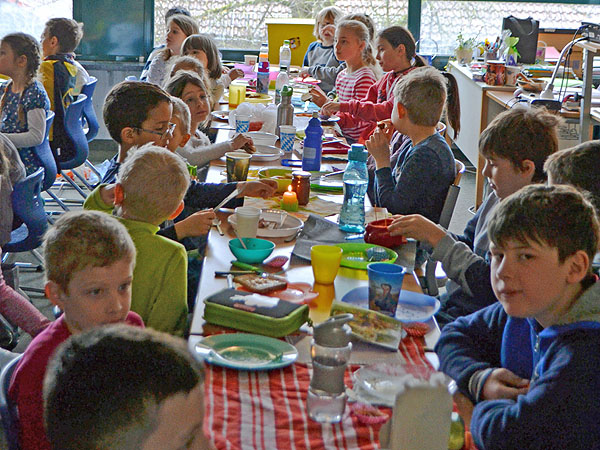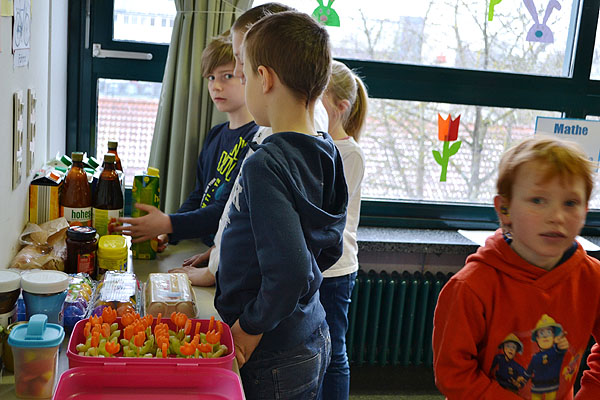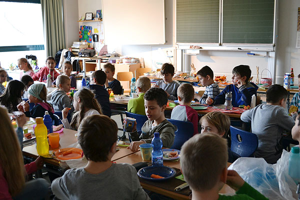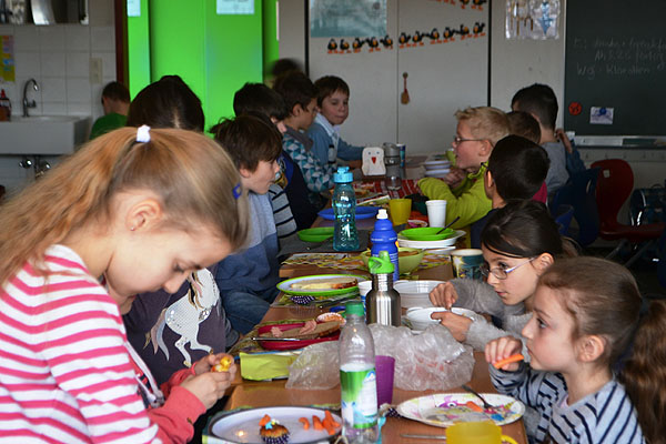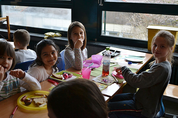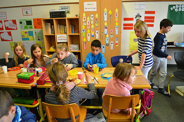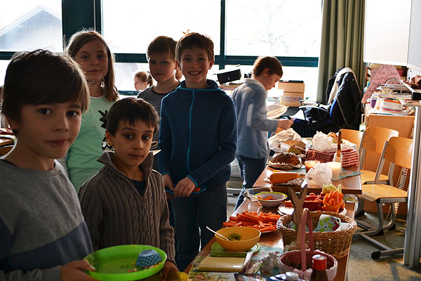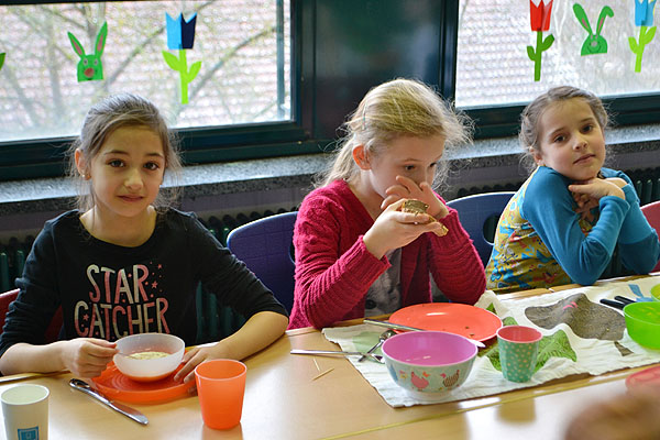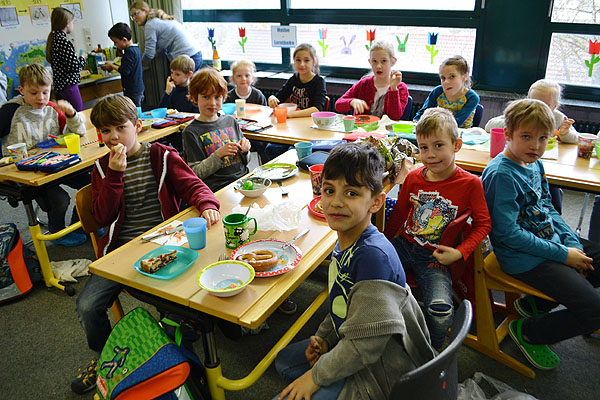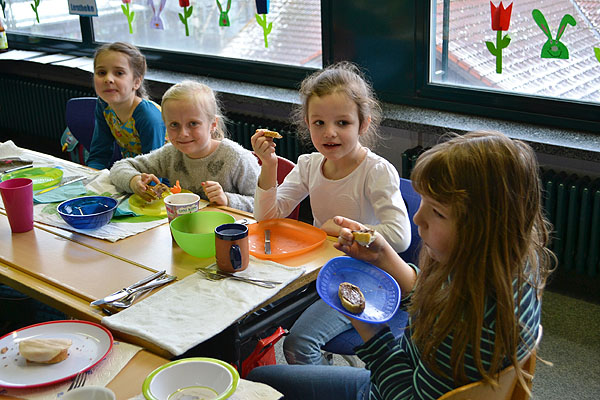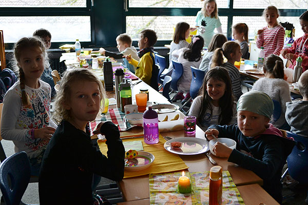 Kurz vor den Osterferien haben einige Klassen etwas Besonderes geplant: Es sollte ein Osterfrühstück geben! Jede Klasse organisierte Lebensmittel für die gemeinsame Aktion. Also wurde vorher Zuhause eingekauft und gebacken, damit alle miteinander feiern konnten. Aufgeregt bereiteten die Schulkinder am Freitagmorgen ein Büffet in ihrem jeweiligen Klassenzimmer vor.